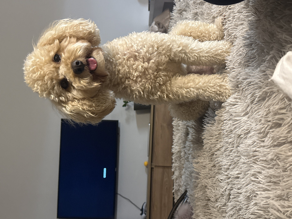 - "A light brown poodle lies on a fluffy grey blanket or cushion" by FM-HTgwN2, licensed under CC BY 4.0