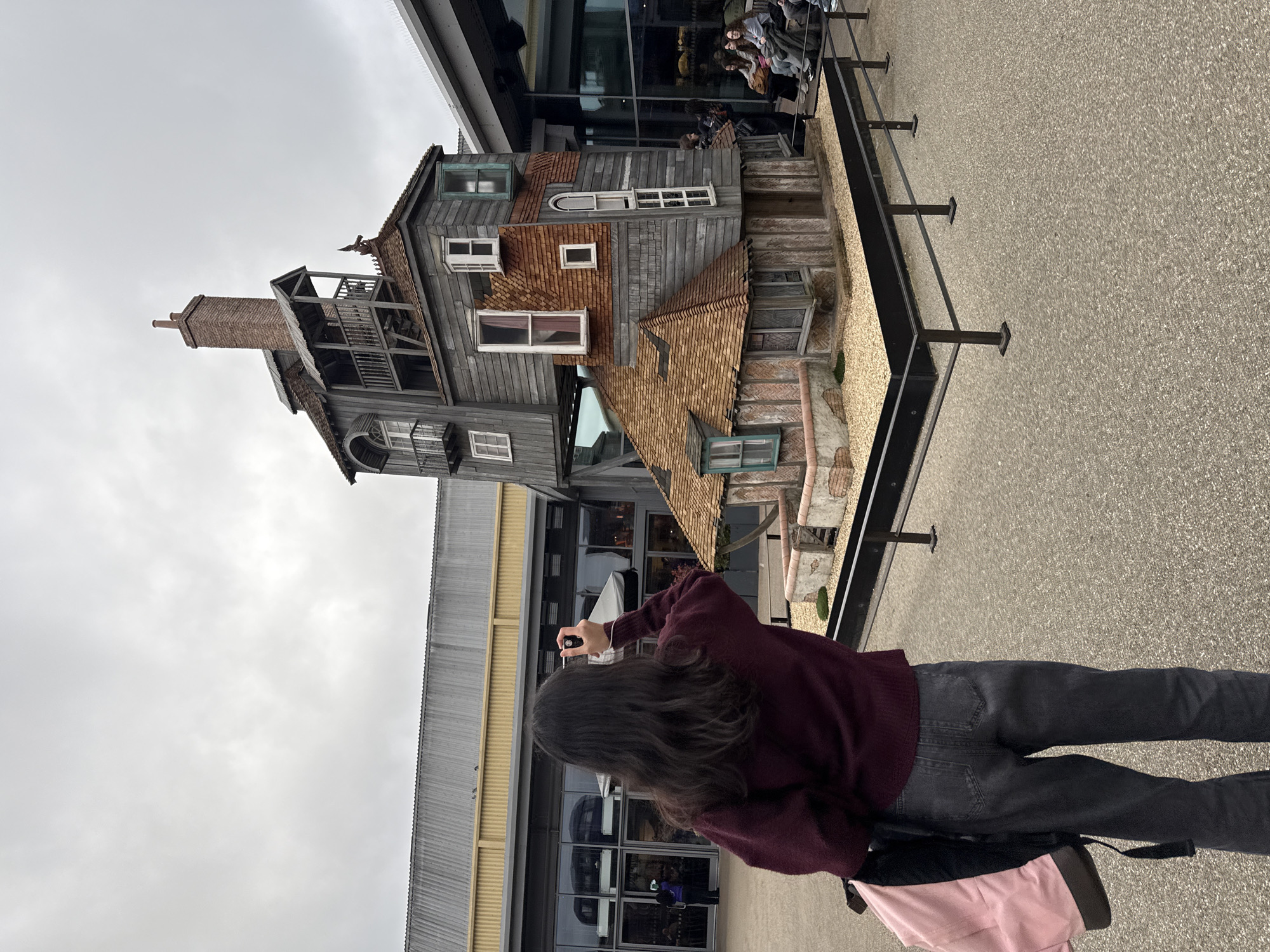 An outdoor scene at the Warner Bros. Studio Tour London – The Making of Harry Potter in Leavesden, Watford, Three Rivers District, United Kingdom, features a large, detailed model of The Burrow from the Harry Potter series. The multi-story model is constructed from weathered grey wood siding and reddish-brown shingle roofing, exhibiting an asymmetrical, leaning design with various windows and a red brick chimney. It rests on a raised, gravel-filled base enclosed by a black metal barrier. In the immediate foreground, a person with dark, long hair, wearing a maroon sweater and dark grey jeans, stands facing away from the camera, holding a dark smartphone horizontally to photograph the model. A pink backpack is carried on their left shoulder. To the right of the model, a group of five to seven individuals are seated on a dark bench. Modern buildings with large glass facades and corrugated metal roofs are visible in the background under an overcast sky. A person in a purple jacket is visible inside a building through glass doors on the far left.