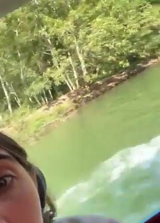 woman taking a selfie on a moving boat. She is looking into the camera while the boat moves on the water. Behind her is the green shore with trees. The boat has a roof. The water is green and churning from the boat's movement. Another person's shoulder and head are briefly visible beside the woman.