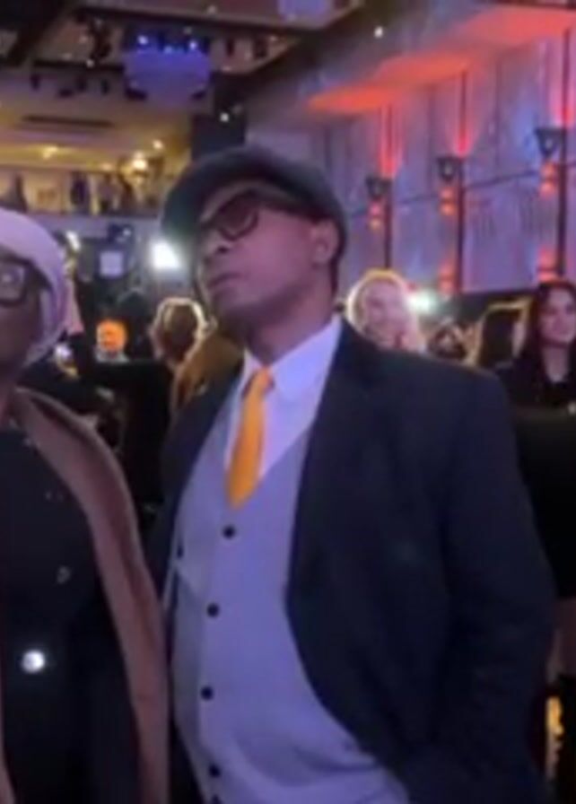 A gathering of people inside a large event space. A woman wearing a tan coat and large black glasses is standing beside a man wearing a dark suit, light grey vest, yellow tie, and a dark cap and sunglasses. Both are looking up. Other people are scattered around the room, some holding up phones, and others are talking in small groups. The room is decorated with lighting that casts a blue and red hue on the walls. The ceiling has patterned tiles and is adorned with lights.