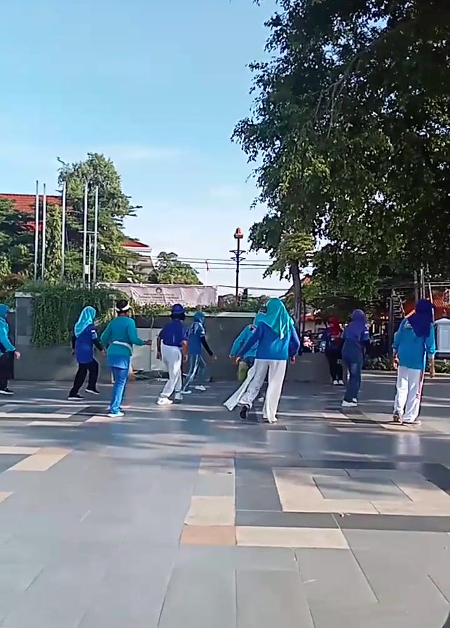 A group of people are standing in rows, dressed in blue and white outfits. They appear to be outdoors on a paved surface, possibly a plaza or walkway, near a tree and some greenery. The sky is blue. The camera angle is a bit unusual, presenting a portrait view.