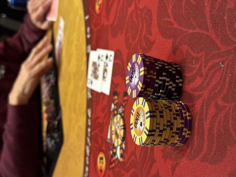 A poker game in progress shows two stacks of poker chips: a yellow and purple stack valued at 1,000 and a purple and black stack valued at 500