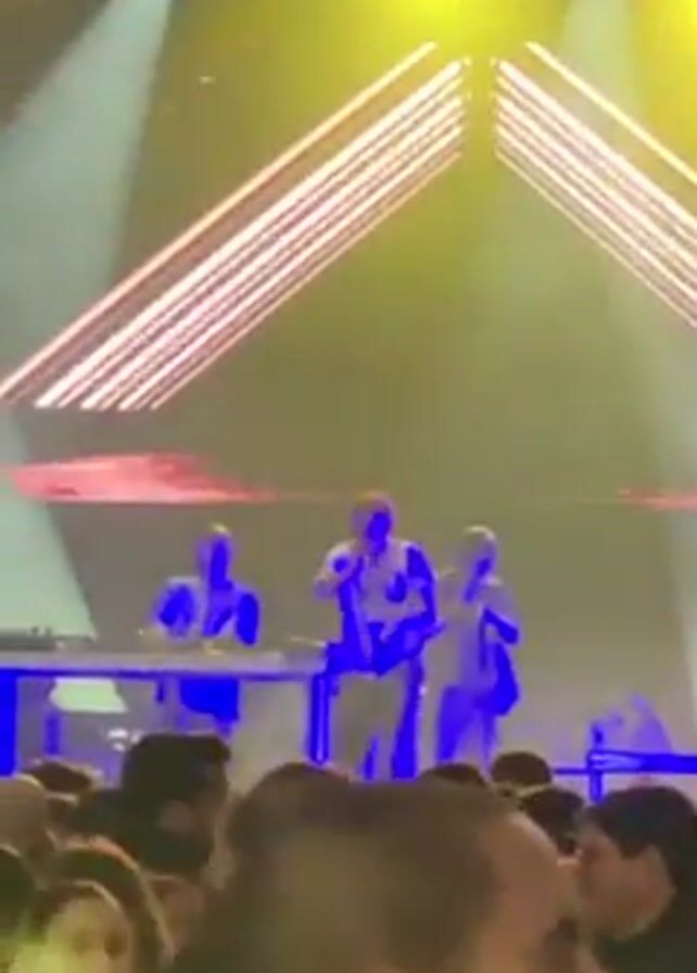 The video captures a live musical performance on a stage in front of a crowd. Three performers are visible on stage: one operating a DJ console and two using microphones. The central performer is wearing a yellow shirt and is actively gesturing. A backdrop featuring a triangular pattern of lights is illuminated. The stage lighting includes beams of blue and yellow. The crowd is tightly packed, and several faces are visible, some smiling. The video seems to be taken from within the audience.