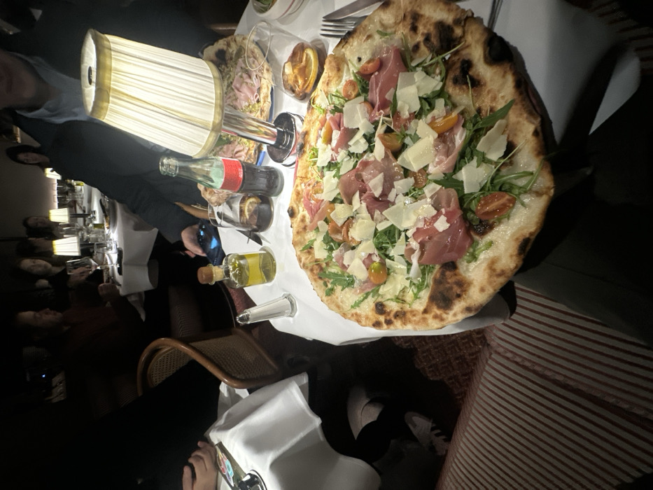 A restaurant table features two pizzas, one with prosciutto, arugula, parmesan, and tomatoes