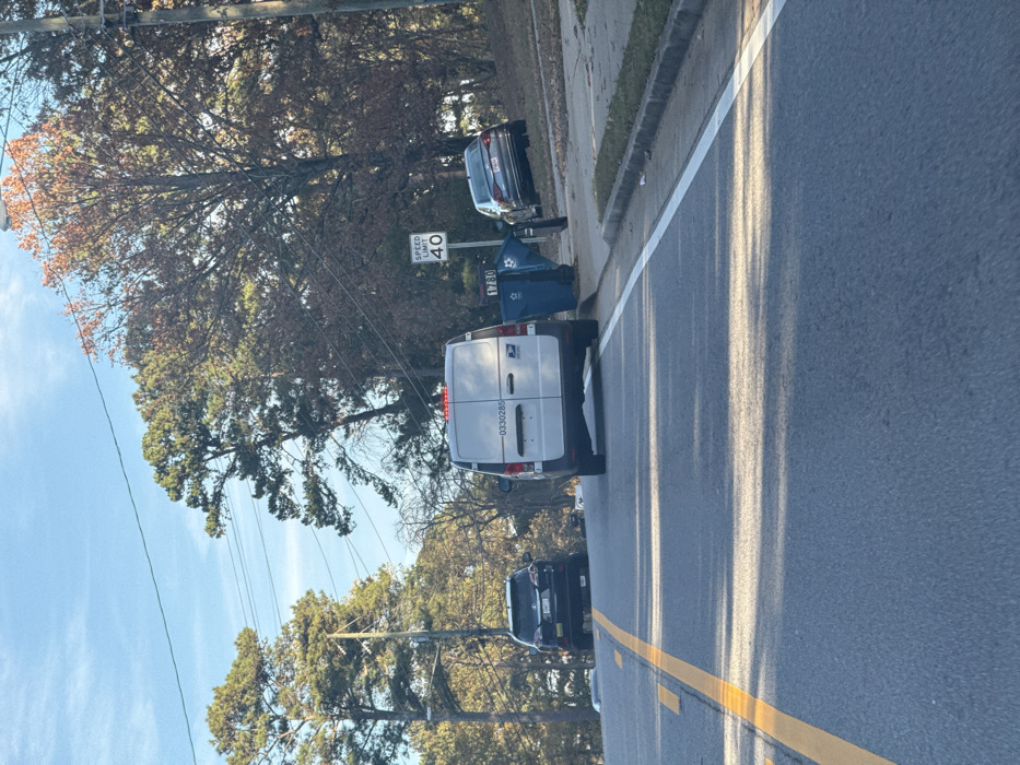 A roadside scene shows a white van parked beside two blue trash bins and a speed limit sign reading "40." A gray sedan is parked behind the bins. A black SUV is parked further back on the road. Tall trees with sparse foliage line the side of the road, and utility poles run along the roadside. The sky is blue.