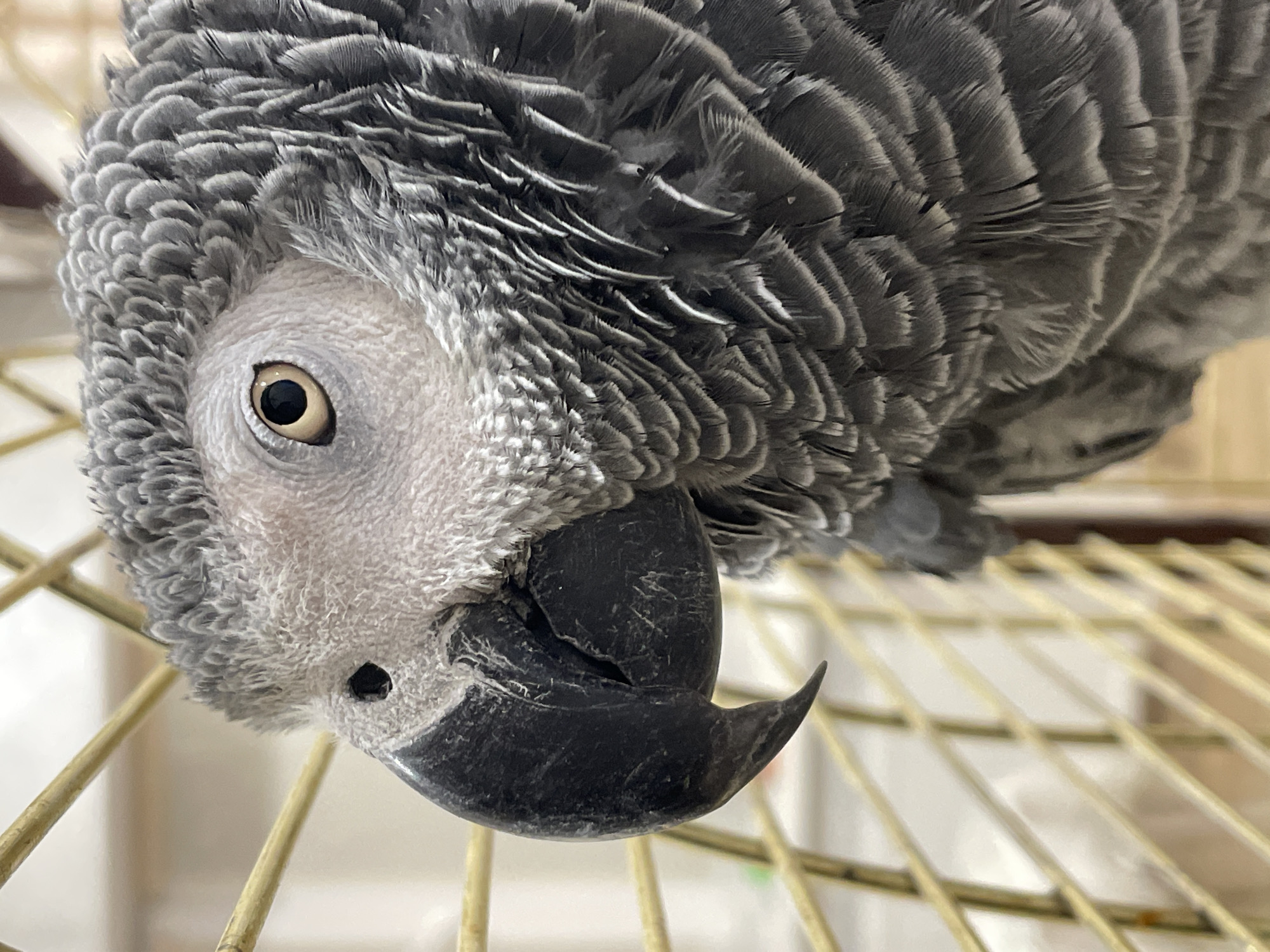 - "A close-up, high-angle portrait captures the right side of a Grey Parrot (Psittacus erithacus) from its head to upper torso, situated within a cage in the city of Ahronomichne, Ukraine" by FM-3Nf8v2, licensed under CC BY 4.0