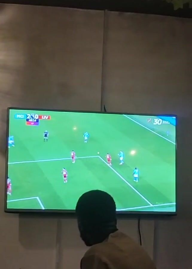 A person is seen from the back, watching a TV. On the TV is a soccer game, the score is MCI 2, LIV 0. The TV is mounted on a grey wall, which is decorated with faux ivy.