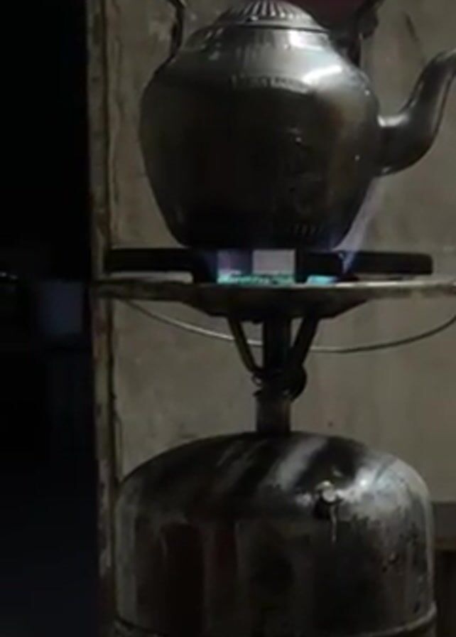 A tarnished metal teapot sits on a small gas stove, a blue flame visible beneath the pot. The stove is connected to a larger, cylindrical gas tank, both showing signs of age and use. The backdrop appears to be an indoor space with plain, possibly unfinished walls.