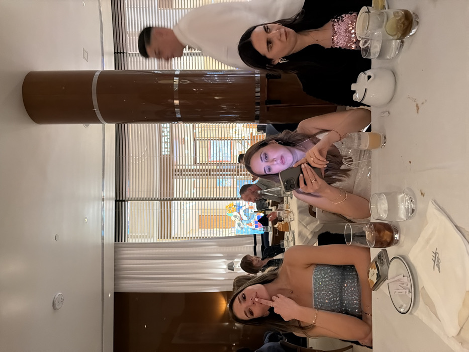 Three women are seated at a table in a restaurant. One woman holds a phone, seemingly taking a picture. Another woman is posing for the photo. A third woman sits next to a waiter. The table is set with drinks, plates, and a napkin. A decorative brown column and windows with blinds are in the background. The restaurant appears to have white walls and curtains.