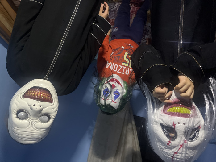 Three individuals in masks and costumes are depicted upside down. On the left, a person wears a black robe with a white mask revealing menacing teeth. In the center, a child in an "Arizona Eagles" shirt sports a Joker mask. To the right, another person, also in a black robe, holds a white mask with red stitches and stringy white hair, its teeth painted bright yellow. The backdrop is a blurry mix of blue and beige.