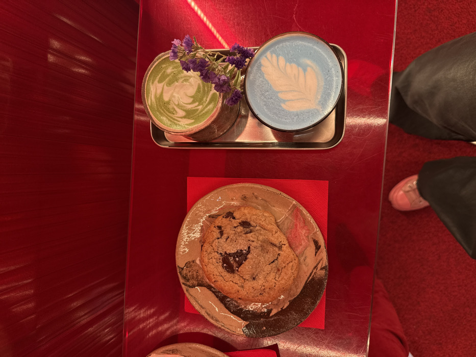 Two patterned lattes, one green and one blue, sit on a small tray adorned with purple flowers. A single chocolate chip cookie is displayed on a decorative plate atop a red napkin. The surface is a glossy red, and a glimpse of a person wearing dark pants and pink shoes is visible on the right side. The scene is a well-composed close-up shot.