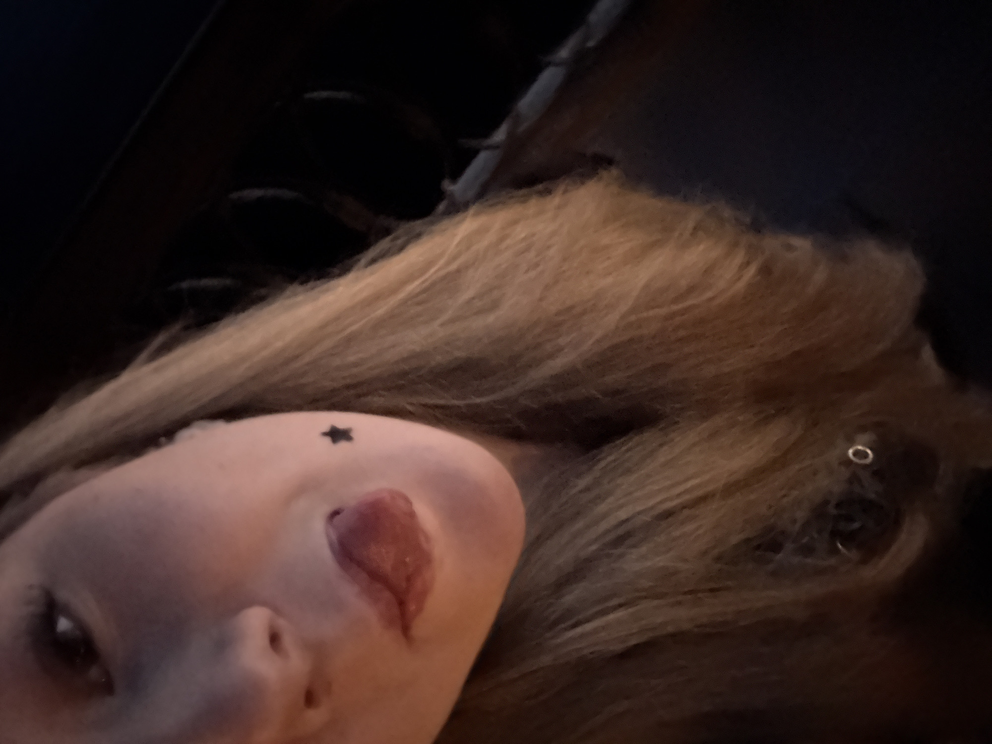 A close-up, tilted selfie depicts a fair-skinned person with long, blonde hair. They are sticking their tongue out. A black star is drawn on their cheek. An earring is visible in their ear. The background is dark and indistinct, not offering any clues about the location, and therefore a specific location in Saint Petersburg, Russia, cannot be determined.