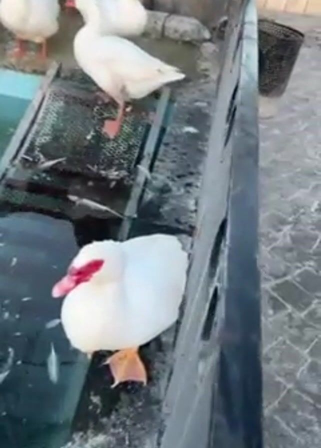 white Muscovy duck sitting on a ledge. The duck has a bright red warty face and orange feet. Behind the duck is a pool of water with fish swimming in it. In the background, other white ducks are gathered near a wooden structure. The duck is mostly stationary, and the camera zooms in for a close-up. The person filming can be heard saying something in the background.