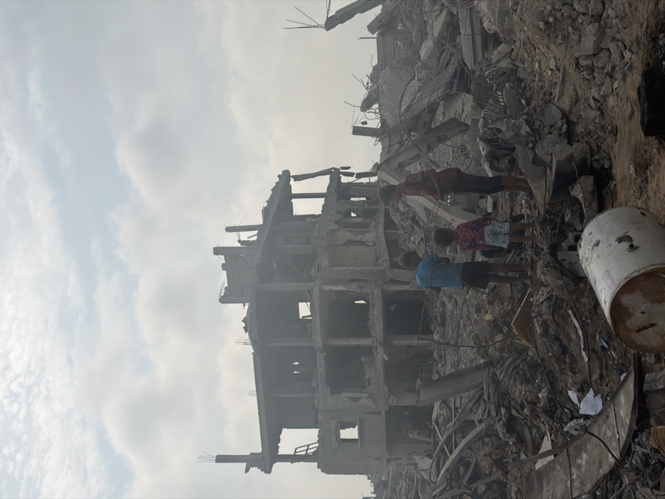 This image depicts a scene of extensive structural destruction in the city of Gaza, Palestinian Territory, under an overcast sky. In the background, a multi-story concrete building stands severely damaged, with large sections of its walls and roof collapsed or missing, exposing internal rebar and skeletal remains of its framework. The surrounding ground is covered in a vast field of rubble, composed of broken concrete, twisted metal, rebar, and debris. In the mid-ground, three children are positioned on the uneven terrain of this rubble. From left to right: one child wears a light blue t-shirt and dark shorts; a smaller child wears a patterned top and light shorts, facing away from the viewer; and another child wears a dark reddish-brown t-shirt and dark pants. All three are standing amidst the debris, observing their surroundings. In the lower-left foreground, a large, light-colored cylindrical object, resembling a metal barrel or tank, lies horizontally on its side, partially obscured by dirt and rubble. The overall environment is characterized by widespread material damage and a dusty or hazy atmosphere.