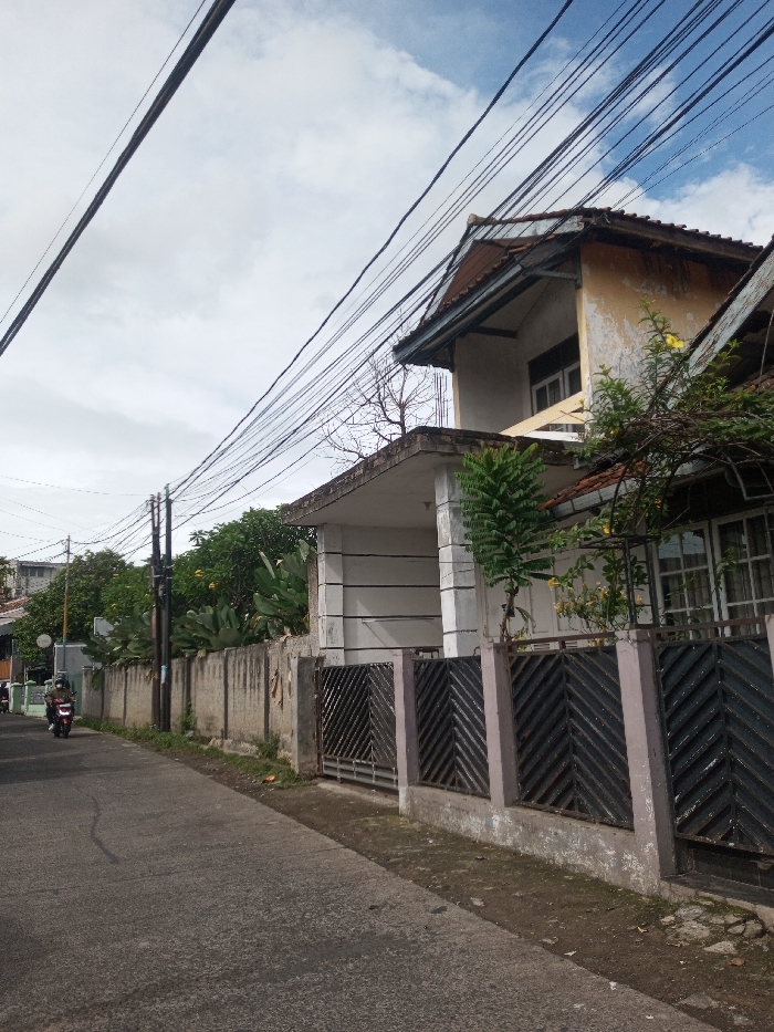 A two-story house stands behind a low concrete wall and a dark metal fence with chevron designs. The house's exterior is a weathered yellow with a visible roofline. Power lines crisscross above the street. The street is asphalt, and a motorcycle drives along it. Foliage and a few small trees are visible behind the wall. The sky is overcast with patches of blue.