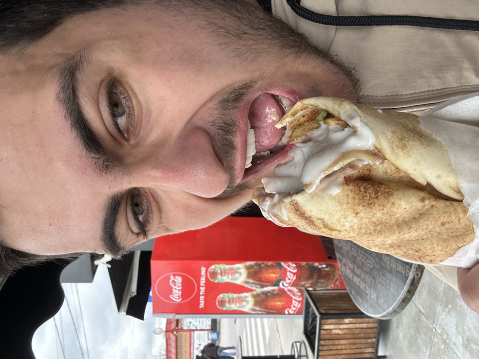 - "A male individual is depicted in mid-consumption of a large, wrapped food item, likely a doner or shawarma, filled with meat, french fries, and white sauce" by FM-BRTx72, licensed under CC BY 4.0