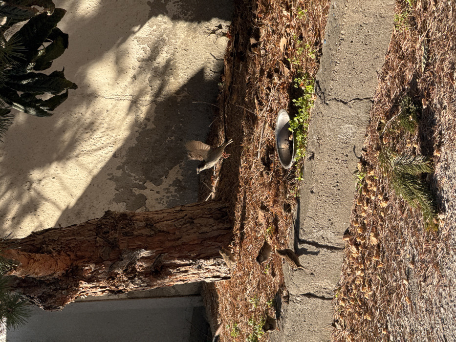 The scene depicts an outdoor environment in the city of Unknown, Unknown, under direct sunlight. A group of small brown birds, identified as sparrows, are present on a ground covered with dried pine needles and scattered bread crumbs. One sparrow is captured mid-air with wings fully extended, positioned above a small, dark metallic feeding bowl containing dark spherical objects. Four other sparrows are visible on the ground, three near the base of a large, rough-barked tree trunk that occupies the left side of the frame, and one near the concrete curb in the lower mid-ground. The tree's upper branches, adorned with pine needles, extend into the upper left. A light-colored, weathered wall with peeling paint forms the background, exhibiting strong, diagonal shadows cast by the tree and an unseen object in the upper right. A concrete curb runs horizontally across the lower foreground, separating the ground with pine needles and the area with more scattered crumbs. A detached pine branch lies on the ground in the lower right foreground.