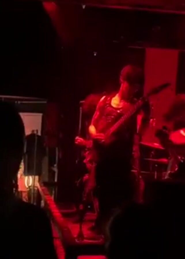 A band performs live on a small stage lit with red lighting. The lead guitarist, wearing a studded vest, plays an elaborate electric guitar. A second guitar player stands to his right. Drums are visible behind them. Silhouetted audience members stand in front of the stage, watching the performance. The environment is dark and appears to be a small music venue.