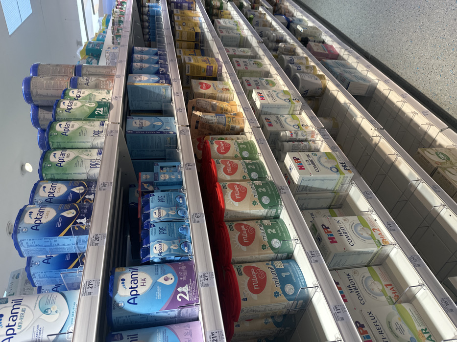 The image displays an interior view of a retail store aisle dedicated to baby formula and infant nutrition products