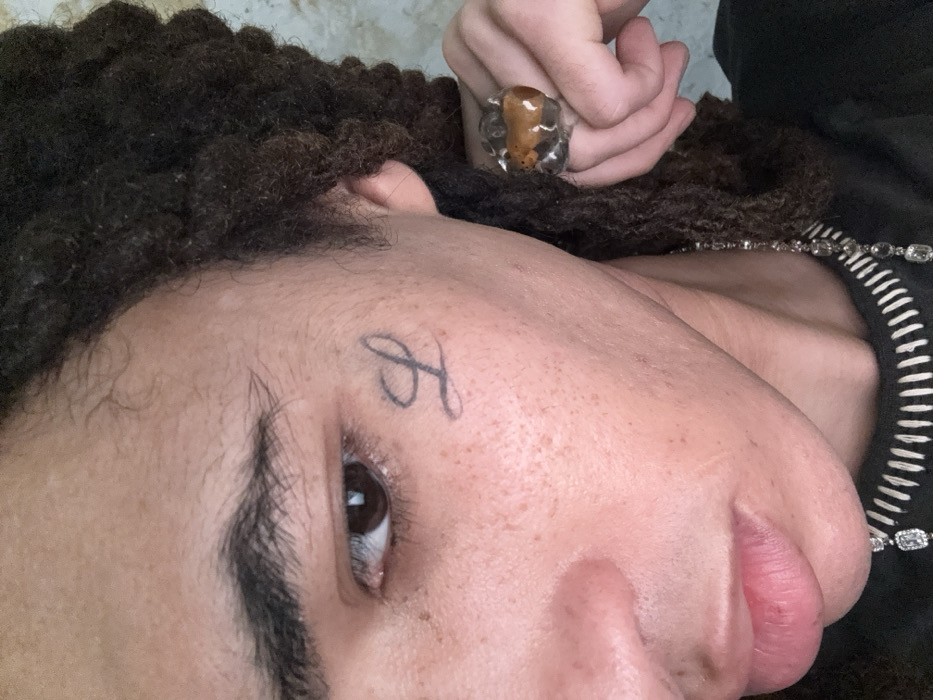 A close-up, tilted view of a person's face, showcasing dark, curly hair and a tattoo resembling the letter "A" or a stylized symbol near the eyebrow