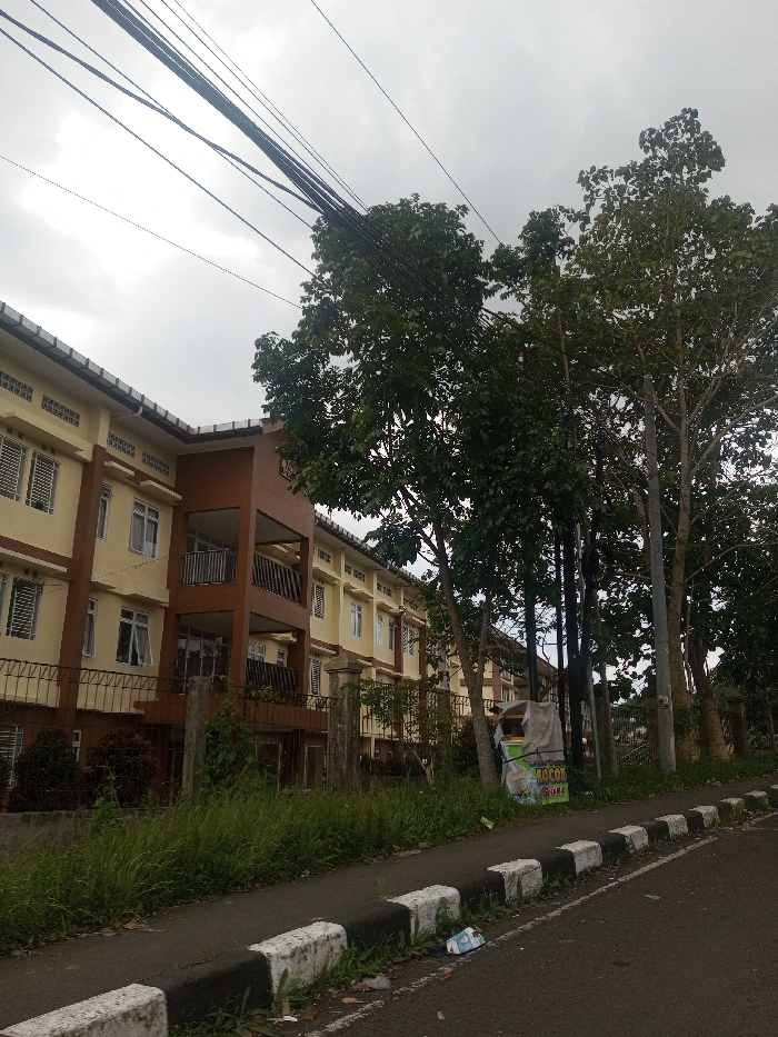 This image depicts a street scene in Kalchini, India, under an overcast sky. In the foreground, an asphalt road runs parallel to a black and white striped concrete curb, with minor debris visible on the curb. Beyond the curb, a strip of overgrown green grass and weeds separates the road from a dark metal fence featuring vertical bars and concrete posts. Behind the fence stands a multi-story building, predominantly light yellow with brown structural elements, including prominent open balconies with dark railings. The building features numerous windows with white frames, some equipped with security bars. To the right of the building, several tall trees with dense green foliage line the street, partially obscuring the building's facade. Among the trees, multiple utility poles are visible, supporting a network of overhead electrical or communication wires that crisscross the upper left portion of the frame. A small, partially obscured street vendor stand, covered with a light-colored tarp and featuring a green banner with illegible text, is situated among the trees on the right side. No individuals are present in the scene.