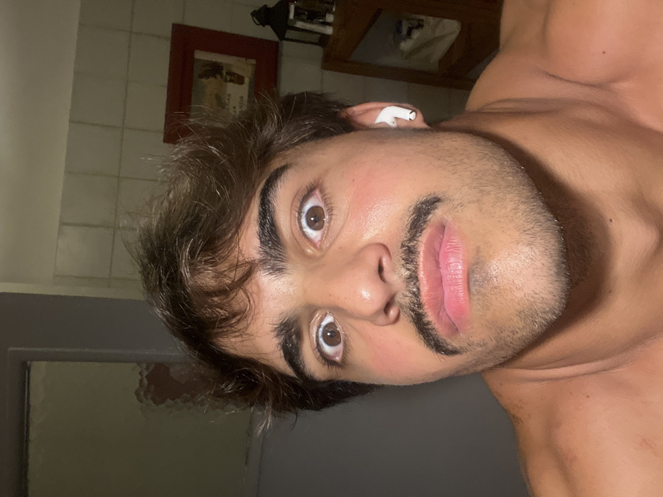 A close-up portrait captures a fair-skinned man with brown eyes and dark, wavy hair