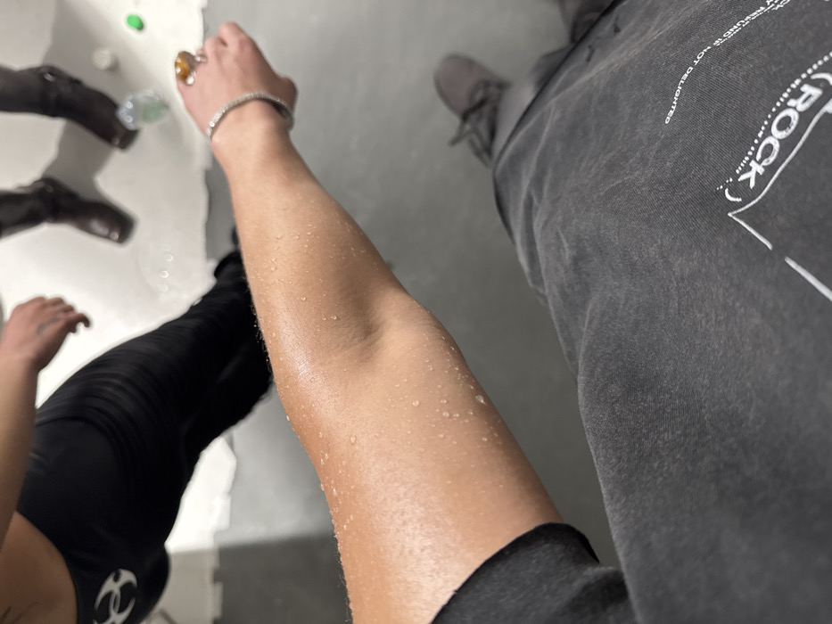 Overhead shot shows a wet arm, adorned with a bracelet and ring, alongside a gray t-shirt with the word "ROCK