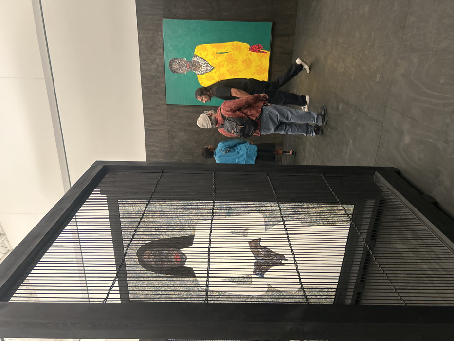 Three people stand viewing art. An oil painting of a woman in a yellow coat against a green background is displayed on the wall. Another installation piece below features black wood framing with horizontal lines of the same material creating a screened effect. An illustration is shown behind the screening. The room's walls are a dark stone color and the ceiling is white.
