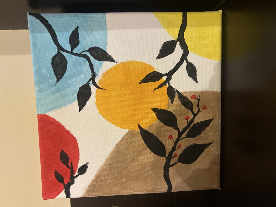 The image displays an acrylic painting on a stretched canvas, presented in a portrait orientation. The painting features an abstract composition on a white background, incorporating several distinct color blocks: a red semi-circle in the upper left, a light blue semi-circle in the upper right, a prominent bright yellow circle centered, a brown irregular shape occupying the lower-left quadrant, and a partial yellow semi-circle in the lower right. Overlaid upon these background elements are multiple black branches with black leaves. Two of these branches, one extending from the lower left towards the center and another in the lower right, also depict small clusters of red berries. The square canvas exhibits a visible texture from the paint application and the weave of the canvas material. The painting is physically positioned upright on a dark, flat surface, likely a table or shelf, and leans against a plain, light-colored wall. The scene contains no individuals, overt actions, or interactions. There is no discernible visual information within the image to establish a specific geographical location, including the city of Sofia, Bulgaria.