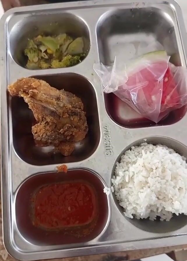 A top-down shot shows a stainless steel cafeteria tray divided into five compartments, sitting on a brown wooden surface. The compartments contain a small portion of green vegetables (likely broccoli and corn), a piece of fried chicken, a red sauce, a small plastic bag of watermelon slices, and a portion of white rice. The tray has "SUS304" stamped into the metal near the rice compartment. In the background, two people are partially visible, both wearing dark pants and appearing to be seated. There is ambient background noise.