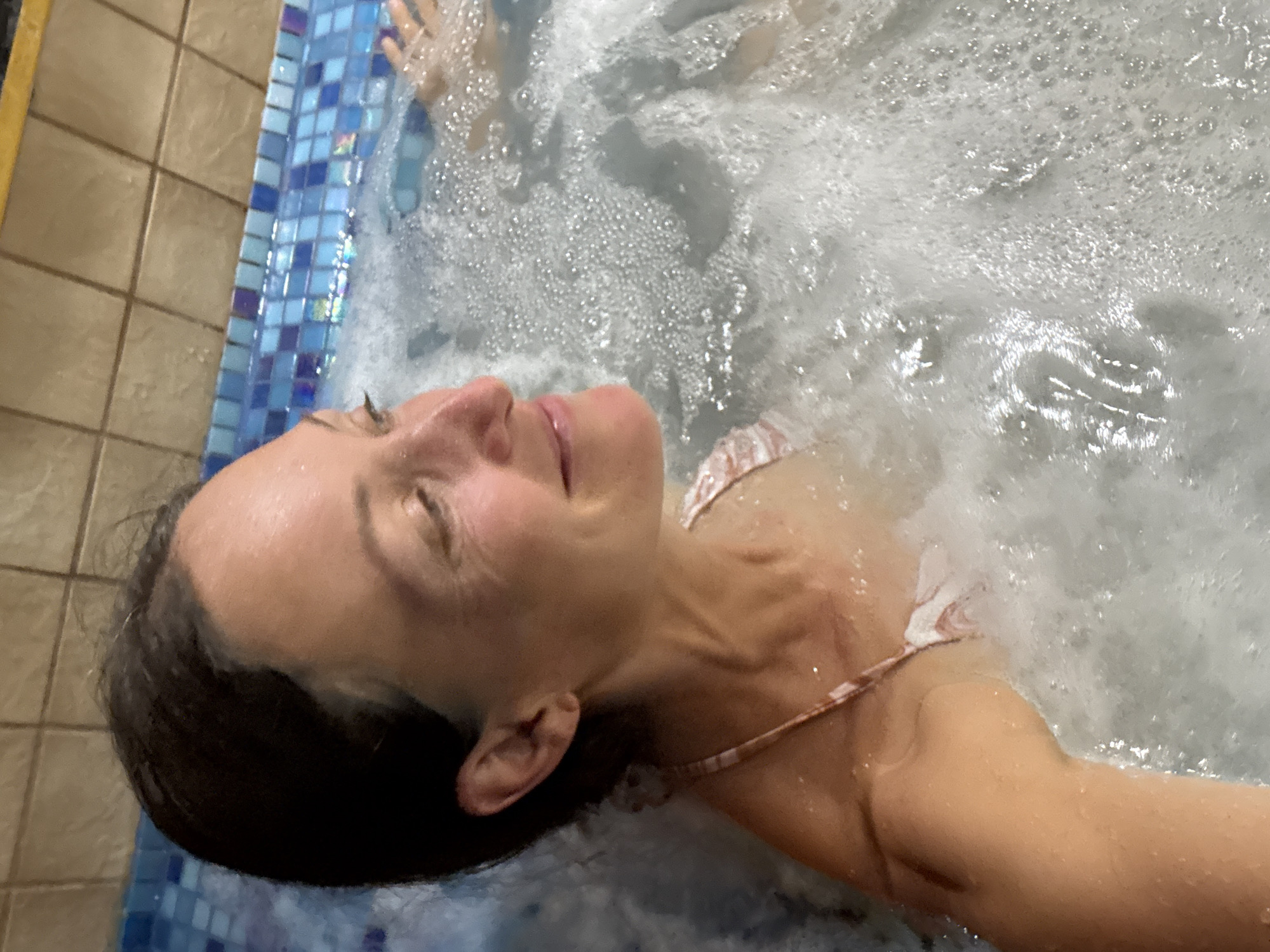 - "An adult female is depicted in a close-up view, submerged from the chest upwards in an actively bubbling hot tub located in the city of Bely Klyuch, Russia" by FM-Ju5AS2, licensed under CC BY 4.0