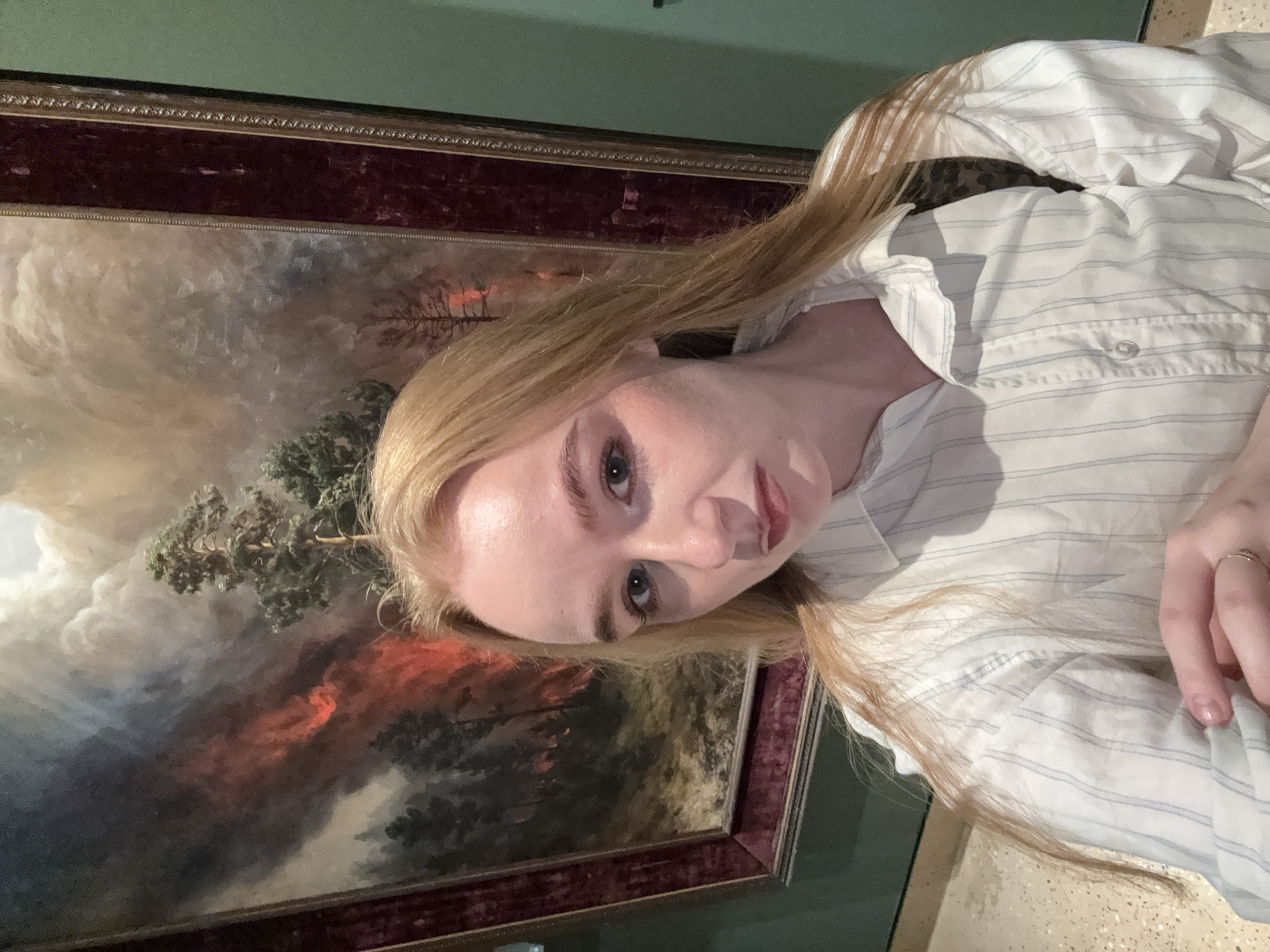 A fair-skinned person with long blonde hair is shown in a selfie-style image next to an oil painting. The painting is framed with a dark red velvet-like material and depicts a landscape with elements of fire and forest. The person is wearing a light blue and white striped shirt. The background includes a dark green wall. The picture was probably taken at Perm State Art Gallery in Perm, Russia.
