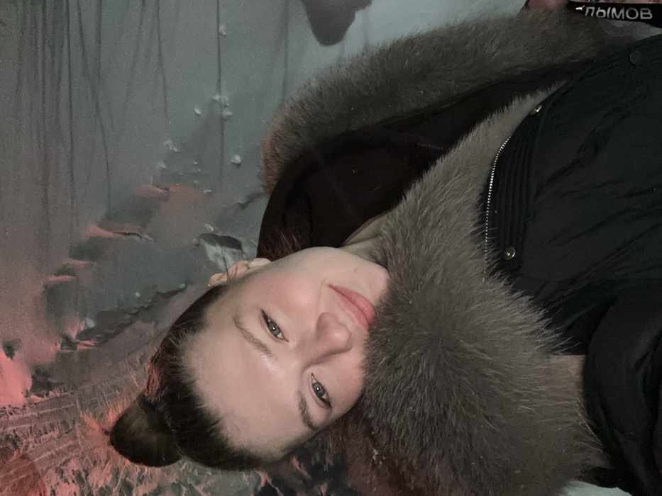 A woman poses in a black down jacket with a large fur-trimmed hood. She's looking directly at the camera with a slight smile. Her hair is pulled back in a bun. The background appears to be an icy or snowy landscape. The overall lighting is muted, suggesting an overcast day. The image is rotated, with the woman's head tilted towards the right.