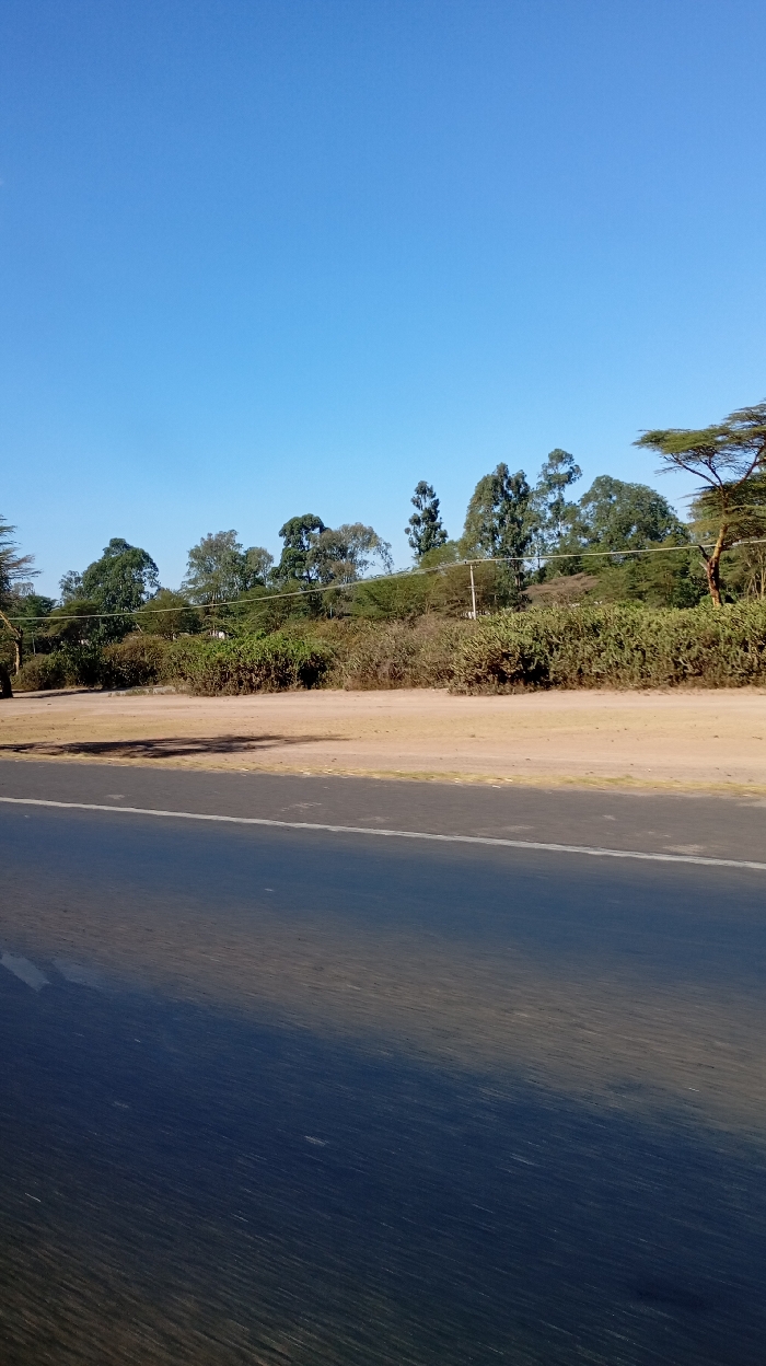 A road stretches into the distance, reflecting the bright blue sky. Beyond the road lies a strip of dry, sandy earth, leading to a dense line of green trees and shrubbery. The trees are a mix of heights and shapes, some reaching taller than others. Utility poles are visible amongst the trees. The scene is bathed in sunlight, creating a serene and clear view.