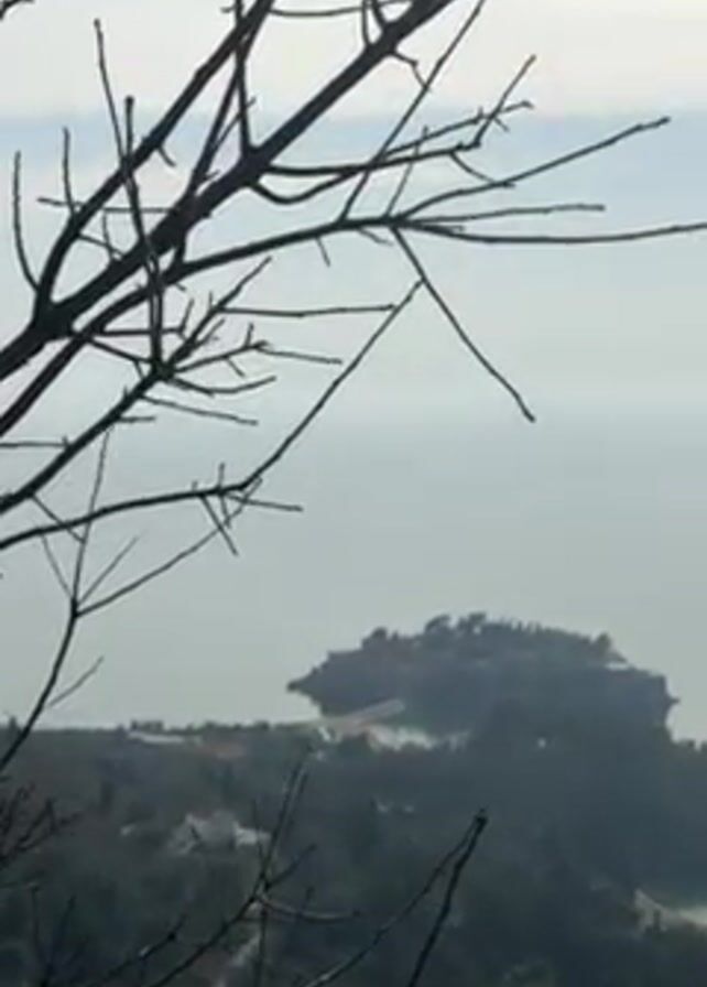 distant view of a coastal island with a cluster of buildings and trees, seen through bare tree branches in the foreground. The island is connected to the mainland by a causeway. The sea surrounding the island is a light grey color. The landscape leading up to the sea is covered with trees and some visible roads. The sky is overcast.