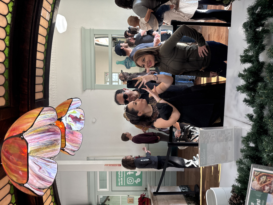 A crowd gathers in a room with a stained glass flower lamp. People stand in line, including a woman with a baby and a group posing for a selfie. A man in sunglasses holds the phone. Signage and holiday decor are visible. The room has light walls, a window, and intricate architectural details.