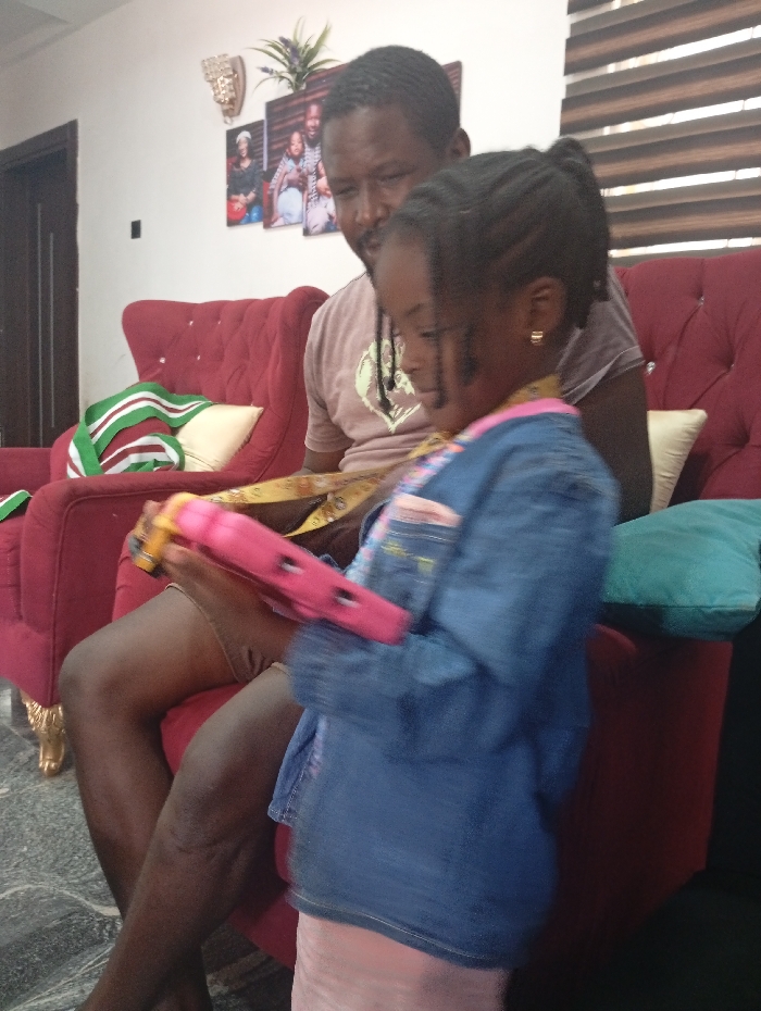 In Narayi, Nigeria, an indoor scene depicts an adult male and a young female child. The adult male, with a dark complexion and short dark hair, is seated on a red tufted armchair, wearing a light-colored t-shirt. A yellow measuring tape is draped around his neck. He looks downward, towards the child. The young female child, also with a dark complexion and braided hair tied back, stands in the foreground, partially obscuring the male. She wears a blue denim jacket over a pink garment and light-colored earrings. She holds a pink and yellow toy, possibly a toy car, in her hands and appears focused on it. The background features a white wall with a light fixture, a small potted plant, and a multi-panel framed photograph displaying images of several individuals. To the right, horizontal blinds cover a window. The floor is tiled with a grey patterned design. A cream-colored pillow and a green and white striped fabric are visible on the armchair next to the male. A teal pillow rests on an adjacent red armchair.