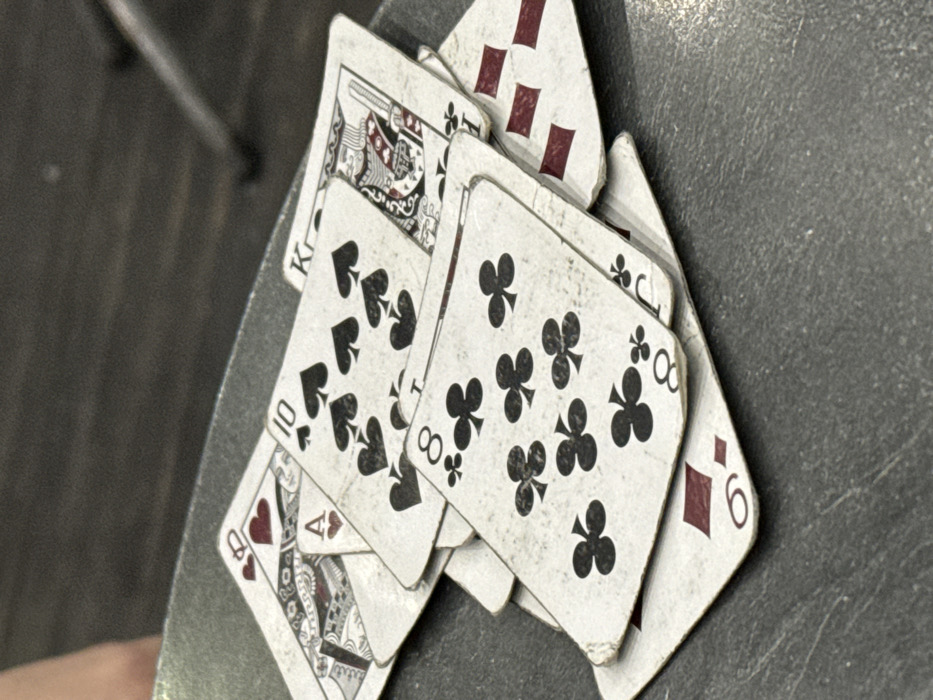 - "A close-up, slightly elevated shot shows a disordered stack of worn playing cards resting on a dark, textured, possibly grey, table surface" by FM-cObir1, licensed under CC BY 4.0