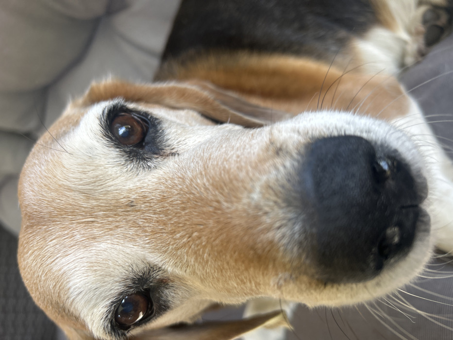 - "The image displays a close-up, head-on view of an older tri-color Beagle dog, positioned indoors" by FM-YBWU82, licensed under CC BY 4.0