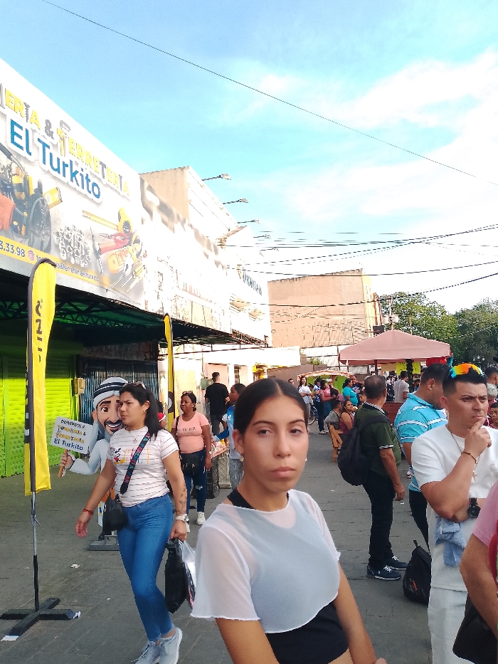 A street scene captures a diverse group of people. In the foreground, a young woman in a white top and black shorts looks directly at the camera. Beside her and in the background, people walk past a storefront named "El Turkito", identified by its signage and cartoonish mascot on a flag. Some individuals are gathered under a red and white canopy further back, while others mingle in the open area under a bright blue sky.