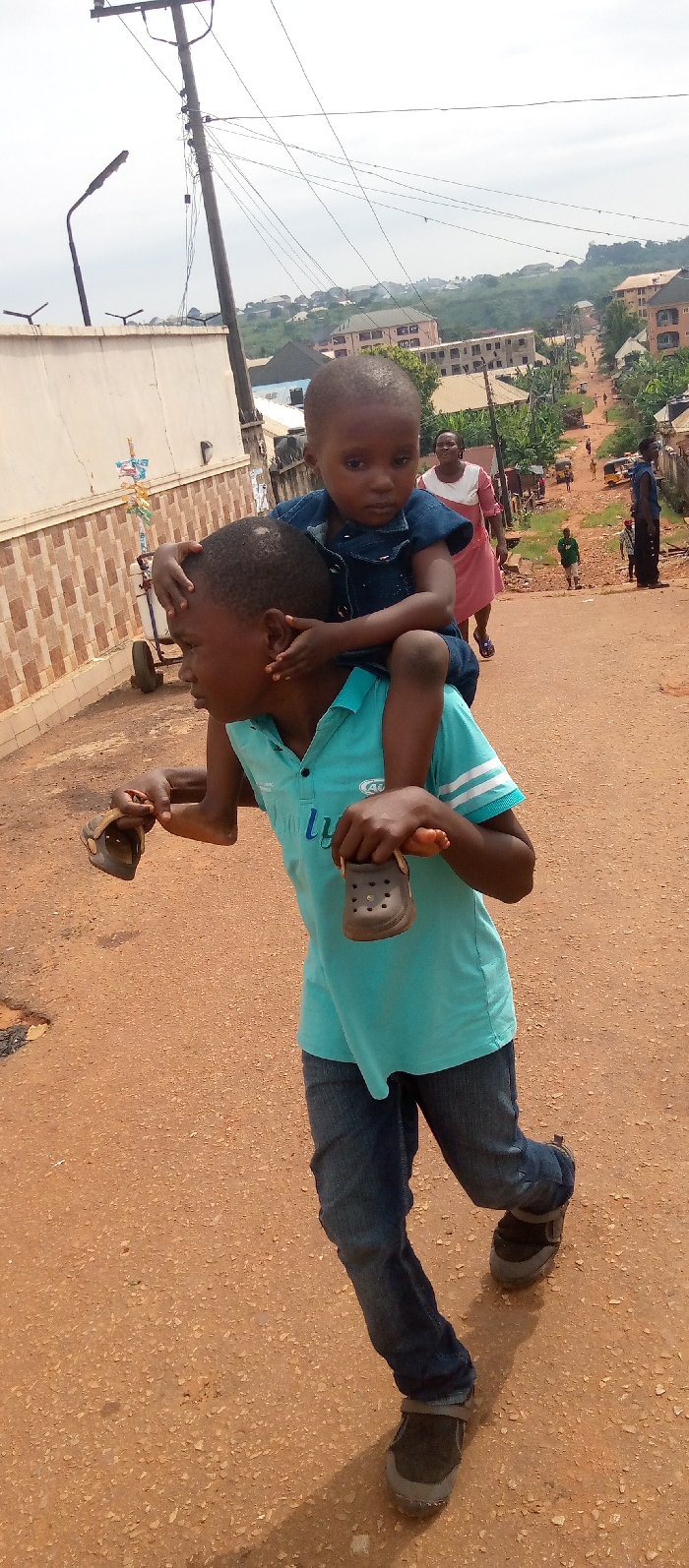 - "An image taken in Nsugbe, Nigeria, depicts a young boy carrying a toddler on his shoulders as they walk down a reddish-brown, unpaved road" by FM-dAQGl2, licensed under CC BY 4.0