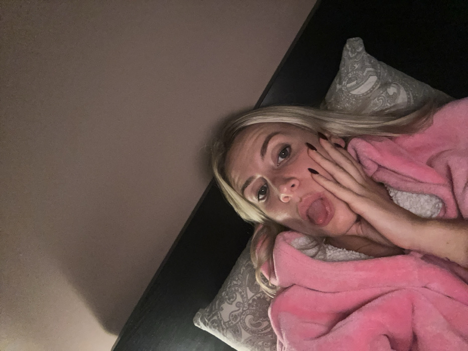 A person with light blonde hair is lying in bed, wearing a pink fluffy robe over a white, textured garment. The person's eyes are wide and directed toward the camera, and their mouth is open with their tongue sticking out. Their hands are raised to their cheeks. The background includes a gray paisley pillow, a dark headboard, and a tan wall. The overall image has a casual, candid quality.