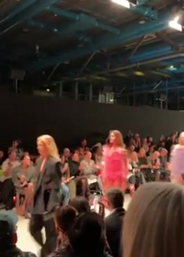 fashion show with models walking down a runway in front of an audience. The runway is a light-colored surface with a dark background. The audience is seated on either side of the runway. Several people are recording the show with their phones. The models are wearing various outfits, including a black blazer, a short, pink dress with feathers, and a similar lavender dress. The environment looks like a large indoor space with industrial features on the ceiling, including pipes and lighting fixtures. The general atmosphere is lively and upbeat.