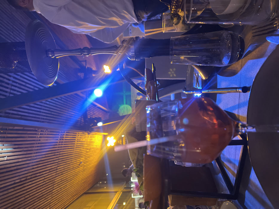 The image depicts an indoor evening scene within an upscale establishment in Yerevan, Armenia, likely a lounge or restaurant. The perspective is low-angle, looking across a table. In the immediate foreground, a stemmed glass holding a reddish beverage with a white straw is positioned over a dark plate. Adjacent to it on the right, other table settings include an empty clear glass, a dark pen-like object, and partial views of cutlery and white bowls on a dark tablecloth. A prominent dark-colored hookah (shisha pipe) with a metallic base and circular tray stands in the mid-ground, bathed in blue light. To the left, a multi-tiered food platter holds an orange bowl containing leafy green items and other provisions. A plastic bottle labeled "ROY" is also visible. The background reveals a ceiling constructed with parallel wooden slats. The area is illuminated by dynamic, artificial lighting, featuring distinct beams of yellow and blue light originating from various fixtures. Blurred figures of individuals are present throughout the background; one person in a white shirt is partially visible standing to the right of the hookah, facing away from the camera. The overall environment suggests an active social setting.