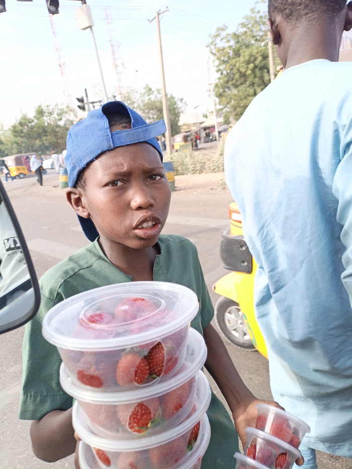 A young boy wearing a green shirt and blue baseball cap holds several clear plastic containers filled with strawberries. He looks directly at the camera with a slight frown. Another person stands to the right, partially obscuring the background. A yellow three-wheeled vehicle is visible behind them. The scene is outdoors on a sunny day, with traffic lights and other people in the blurred background.