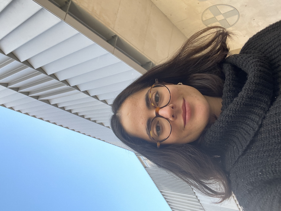 A young adult female with dark, shoulder-length hair and round tortoise-shell glasses is depicted in a close-up, upward-angled shot. She wears a black knitted cowl-neck sweater and a small hoop earring in her right ear, looking directly at the camera with a slight smile. The background consists of modern architecture and a clear blue sky. To the upper left and right, a building with a light-colored, vertically slatted or louvered facade is prominent, angling upwards. Below the slatted structure on the right, a light-colored, possibly concrete wall is visible, featuring a partial circular emblem with a cruciform or segmented design. This architectural setting is located at the **Museo Nacional Centro de Arte Reina Sofía in Madrid, Spain.**