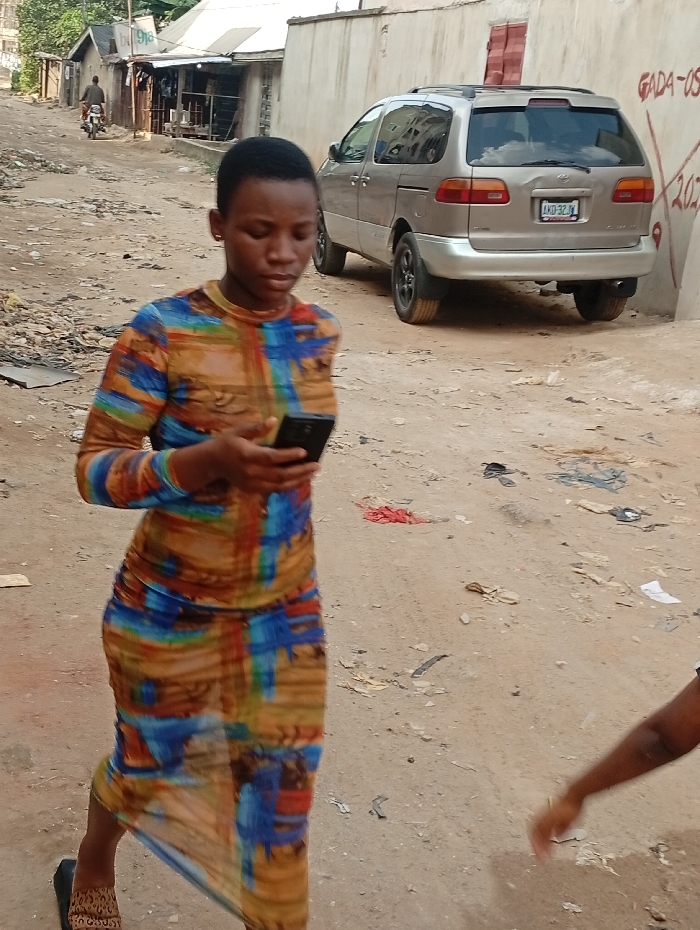 A woman stands on a dirt road, engrossed in her phone. She wears a colorful, fitted long-sleeved dress. Behind her, a minivan is parked next to a wall with faded graffiti. In the distance, a motorcycle drives down the road past buildings. The road is littered with trash. A person's arm is partially visible in the bottom right corner. The overall scene is a candid street view.