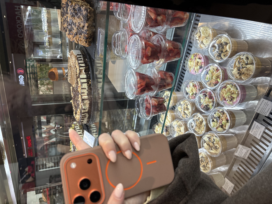 A close-up image captures a refrigerated display case filled with various desserts and fruit cups inside a cafe, likely "Grej Coffee & More" in Skopje, North Macedonia. In the foreground, a human right hand with light skin and manicured light pink nails holds a matte brown iPhone case featuring a visible orange circular MagSafe emblem and a three-lens camera module. The person's arm is partially visible, clad in dark, textured fabric. The display case is organized into three shelves. The top shelf features two large, round, pre-sliced cakes: one light-colored with dark chocolate drizzle and nuts, and another darker, rectangular dessert with a crumbly topping. A smaller segment of a green-hued cake is visible on the far left. The middle shelf holds approximately ten clear plastic cups with domed lids, each filled with fresh, cut strawberries and some raspberries. The bottom shelf presents numerous similar clear plastic cups, containing various layered parfaits or overnight oats topped with fresh fruit (including sliced bananas, berries, and green fruit), granola, and nuts. Small white labels with Macedonian text, presumably listing product names and prices, are positioned in front of these items. Reflections on the glass display case reveal reversed signage including "GREJ" (ГРЕЈ) and partial "SAHARO" (САХАРО), a red illuminated sign, and an outdoor view featuring greenery and an orange cylindrical trash receptacle, indicating a commercial establishment with an external view. No direct human interaction is depicted beyond the hand holding the phone.