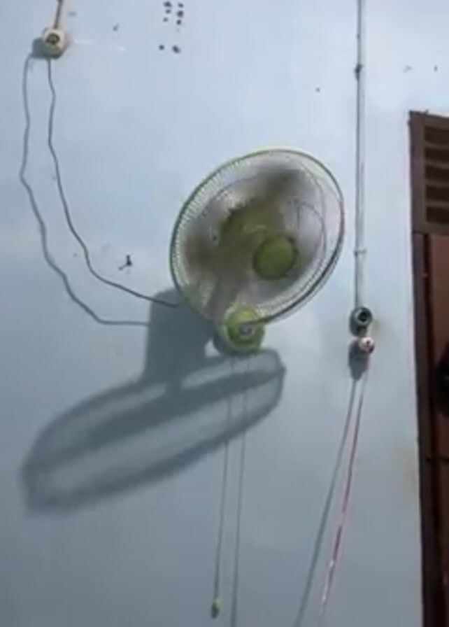 wall-mounted electric fan with a green frame and blades rotating. The fan is mounted on a light blue wall. Above the fan, there are several electrical outlets and wires running along the ceiling. A closed, brown shuttered window frame is visible to the right of the fan. The fan's shadow is cast on the wall below it. Two pull cords hang from the bottom of the fan. The overall impression is that of a simple, somewhat dated interior.