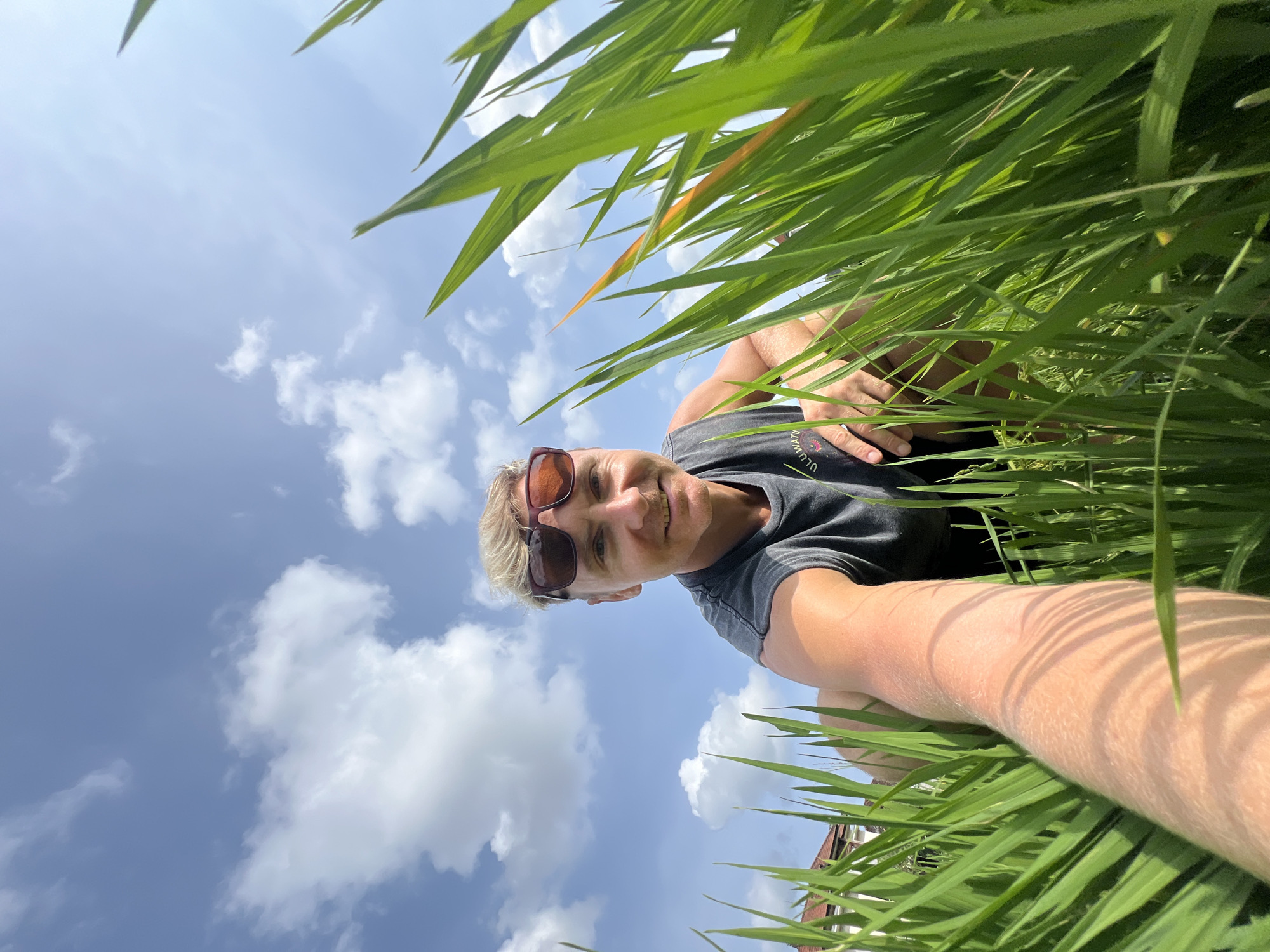 - "An adult male with light skin and blond hair, wearing brown-framed sunglasses and a dark sleeveless shirt, is positioned low within a field of tall, green, grass-like vegetation, consistent with a rice paddy, in Celuk, Indonesia" by FM-xgQP92, licensed under CC BY 4.0